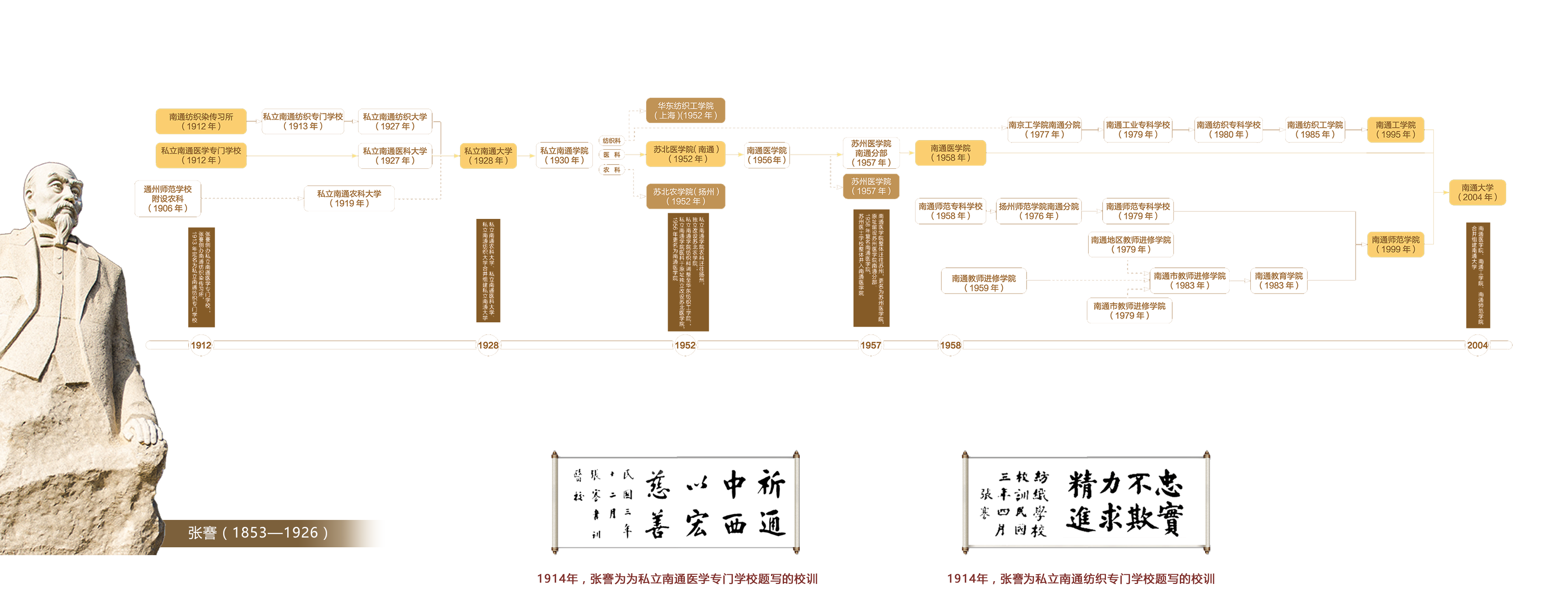 1912年3月,张謇借南通城南庙宇籍仙观创办私立南通医学专门学校,这是国人最早创办的私立高等医学院校之一,是我国民办高等医学教育本土化的发端。1912年4月,张謇在南通唐闸借资生冶厂创办南通纺织染传传习所,同年秋改称南通纺织学校,次年定名为南通纺织专门学校。这是中国最早独立设置的纺织专科院校。张謇(1853-1926),字季直,号啬庵,清末状元。中国近代著名爱国实业家、教育家,立宪运动领袖。辛亥革命后,促进民主共和,拓展地方自治。1853年出生于江苏海门常乐镇一个小瓷商兼治小农的家庭。1868年考中秀才,1885年顺天府乡试考中举人,1894年考中恩科状元,授翰林院修撰。1904年,清政府赏三品衔,任商部头等顾问官。1909年当选为江苏咨议局议长。1911年当选为中央教育会长、江苏临时议会议长,同年任江苏两淮盐政总理。1912年任中华民国临时政府实业总长。1913年任民国北京政府农商总长,1914年任民国北京政府全国水利总局总裁。曾应聘主持赣榆选青书院(1888)、崇明瀛洲书院(1893)、安庆经古书院(1896)、江宁文正书院(1896)等传统教育机构。1912年张謇与其兄创办了私立