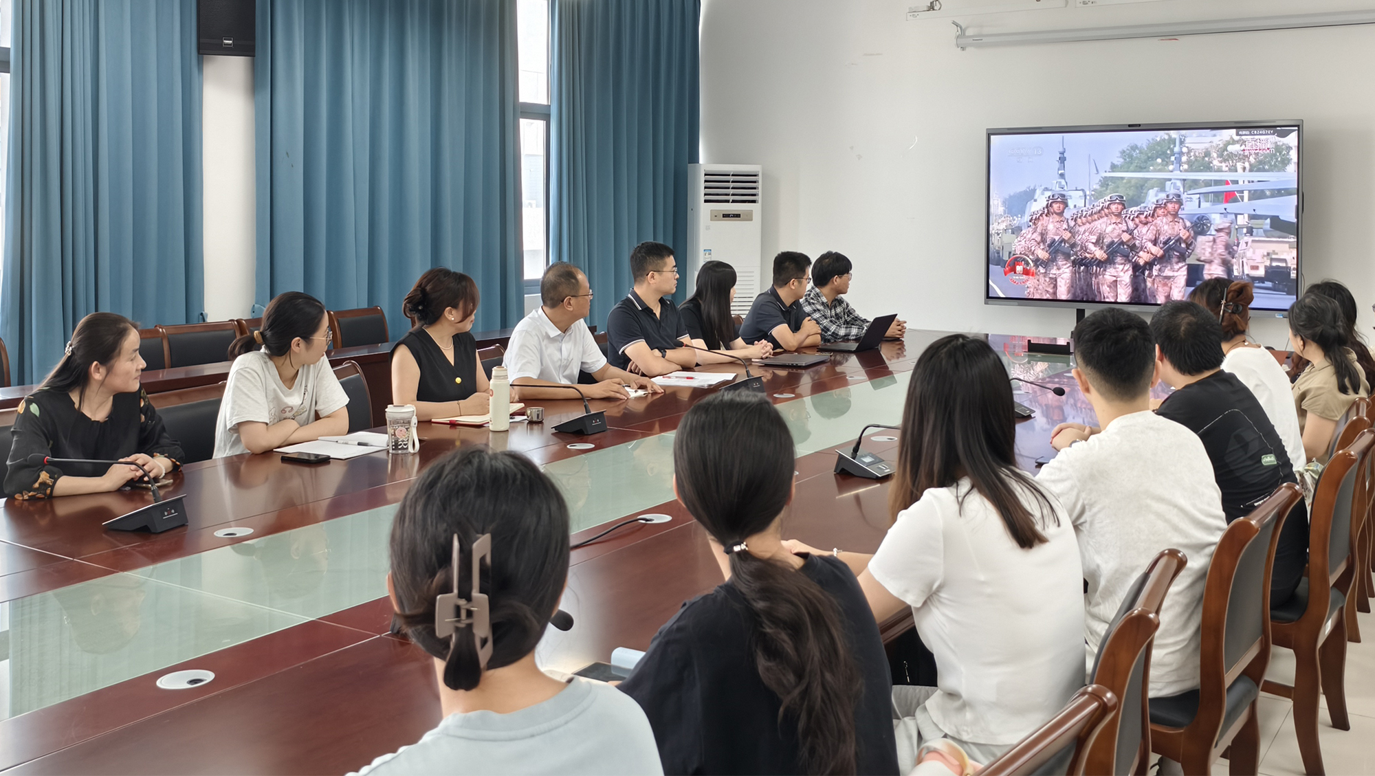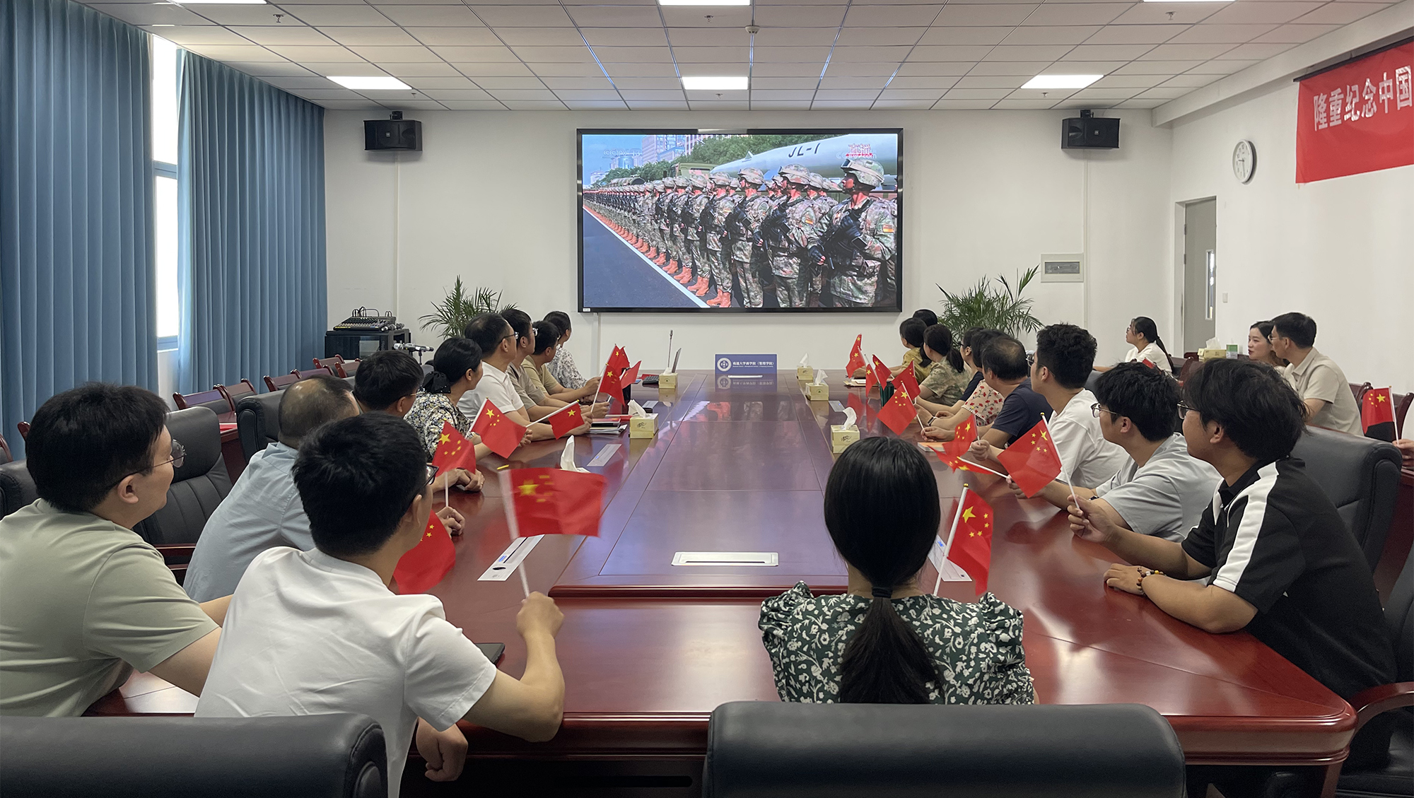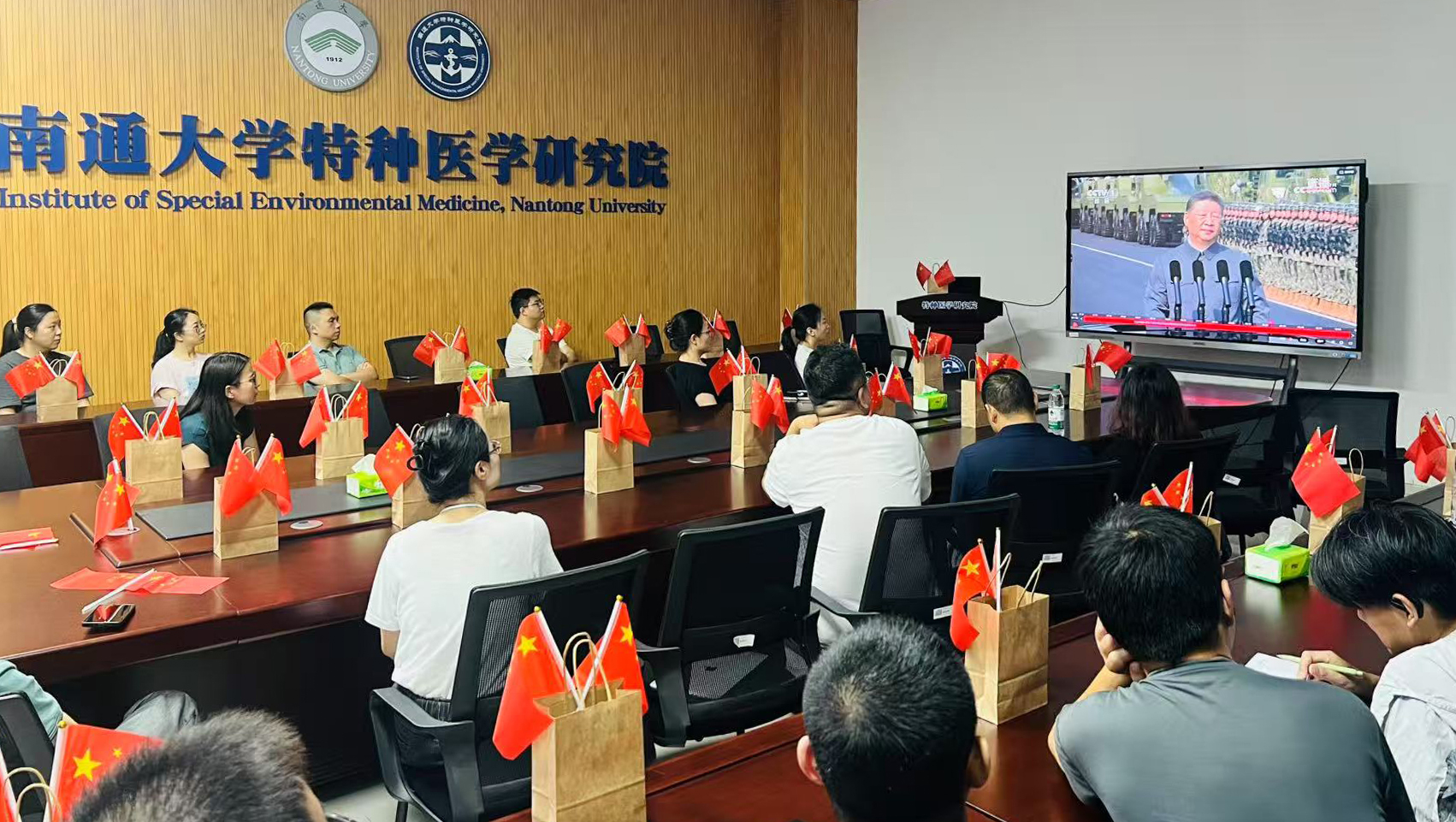 阅兵展现的不仅是国威军威,更是伟大抗战精神的时代传承。校党委常委、组织部部长吴如高表示,要将伟大抗战精神有机融入党员教育和干部培训之中,通过创新教育形式、强化实践担当,引导党员干部深刻领悟蕴含其中的爱国情怀、民族气节、英雄气概和必胜信念,推动党员干部从抗战历史中汲取奋进力量,以更加坚定的信念、更加饱满的热情、更加务实的行动投身学校高质量发展的进程之中。校党委常委、宣传部部长陶锋表示,要坚持以习近平新时代中国特色社会主义思想为指导,深入贯彻落实习近平文化思想,传承和弘扬伟大抗战精神,从先辈的英勇事迹中汲取力量,不断提升高校宣传思想文化的引领力、传播力、影响力,生动讲好百年通大发展故事,引导师生厚植爱国情怀,在新时代勇担使命,为以中国式现代化全面推进强国建设、民族复兴伟业唱响地方高校强音。校党委常委、统战部部长、人武部部长朱城表示,将持续加强对征兵工作的组织领导,激励更多青年学子传承红色基因,投身强军伟业;在校内建成退役军人服务站,努力将其打造成彰显军民团结的重要窗口、国防教育的关键阵地和征兵成果的展示平台。
