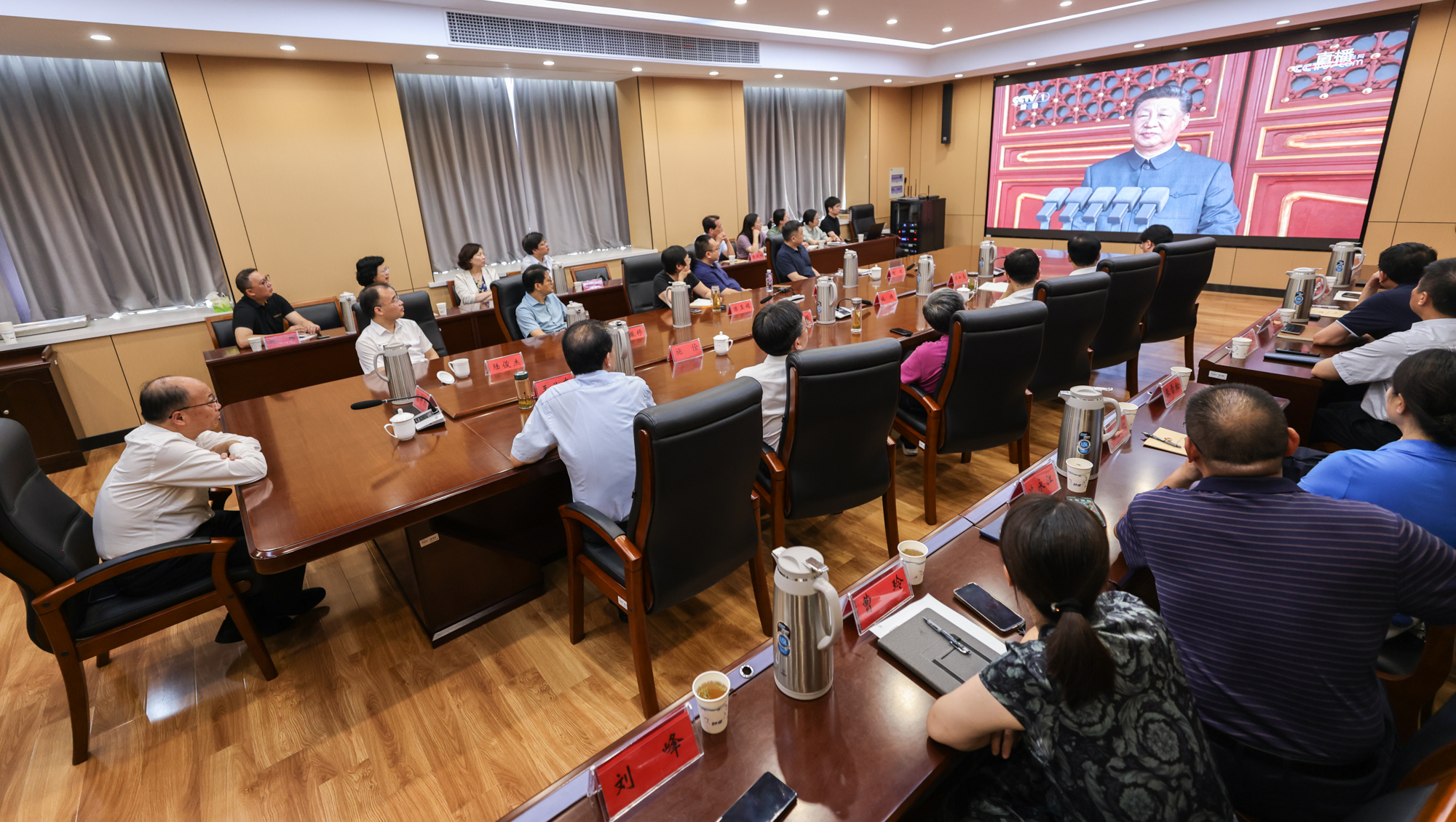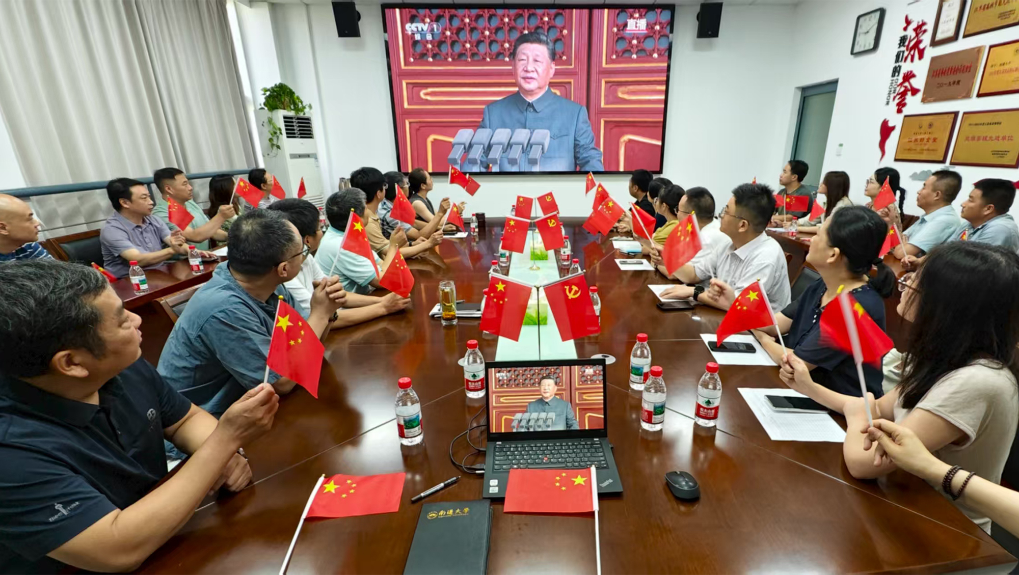 上午9时,80响礼炮响彻云霄,大会正式开始,beat365各收看会场响起阵阵热烈的掌声。随着五星红旗冉冉升起,全体师生肃然起立,跟随着直播画面齐声高唱国歌。在啬园校区逸夫楼 505会议室,校党委理论学习中心组成员认真聆听习近平总书记的重要讲话,深刻感受那段浴血奋战的历史所凝聚的伟大抗战精神。校党委书记杨宇民指出,中国人民抗日战争的胜利是近代以来中国反抗外敌入侵的第一次完全胜利,是中华民族走向复兴的历史转折点和重要起点。伟大抗战精神,是矗立在中华儿女心中的精神丰碑,指引着我们淬砺民族血性、度尽民族劫难、书写民族荣光。他表示,当前,中华民族伟大复兴展现出前所未有的光明前景。我们要从伟大抗战精神中汲取战略定力和澎湃动力,在以中国式现代化全面推进强国建设、民族复兴伟业的征程中,扎根中国大地办好人民满意的大学,大力推进特色鲜明的国内一流大学建设,不断谱写高质量发展新篇章,努力交出无愧于时代、无愧于人民、无愧于先辈的通大答卷。