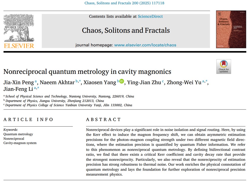 近日,物理科学与技术学院彭家鑫博士团队在非互易量子精密测量研究方面取得新进展,相关研究成果以“Nonreciprocal quantum metrology in cavity magnonics”(腔磁振子学中的非互易量子计量)为题发表在国际著名期刊Chaos, Solitons and Fractals上。beat365中文官方网站为第一署名单位。