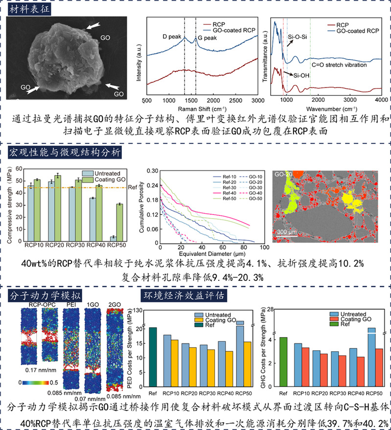 当前,建筑行业面临资源消耗大与碳排放放过高的双重挑战,光水泥生产就占据了全球每年约7—8%的CO2排放。高效利用再生混凝土粉(RCP)替代部分水泥不仅可以有效降低水泥生产和使用过程中的碳排放和能源消耗,还能缓解建筑垃圾回填带来的环境问题,但相对较弱的界面性能始终限制着RCP在水泥中的替代率。该研究创新性地提出利用氧化石墨烯(GO)包覆RCP颗粒的改性方法,优化RCP界面性能,以提高其在水泥基材料中的替代潜力。借助金属侵入、背散射电子成像与人工智能一体化分析手段开展研究,探明了硬化RCP-水泥基体的孔隙结构与GO包覆增强特征。研究结果证实,与纯水泥浆体相比,在40 wt%GO包覆RCP替代率下,复合材料孔隙率可降低9.4—20.3%,抗压强度和抗折强度分别提高了4.1%和10.2%。分子动力学模拟结果揭示GO通过裂纹桥联作用使RCP-水泥复合材料破坏模式从界面过渡区转向C-S-H基体。环境与经济效益分析结果表明40%替代率下单位抗压强度的温室气体排放和一次能源需求分别可降低约39.7%和40.2%。此项研究深化了对GO增强机制的理解,为RCP在环保型水泥基复合材料中的应用提供了一定的理论依据。