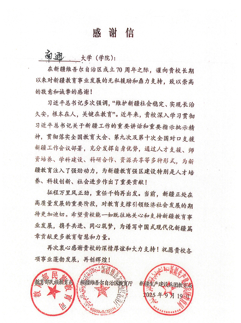 近日,在新疆维吾尔自治区成立70周年之际,教育部民族教育司、新疆维吾尔自治区教育厅、新疆生产建设兵团教育局联合向beat365发来感谢信,感谢beat365长期以来对新疆教育事业发展的援助和支持。
