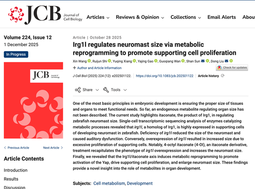近日,特种医学研究院王新博士在国际权威期刊Journal of Cell Biology(JCB)发表题为“Irg1l regulates neuromast size via metabolic reprogramming to promote supporting cell proliferation(Irg1l 通过代谢重编程促进支持细胞增殖以调控感觉器官大小)”的研究成果,首次揭示了代谢信号参与器官发育调控的新机制。王新和博士生石瑞珺、高亚静,硕士生相雨情为共同第一作者,生命科学院刘东教授与复旦大学附属眼耳鼻喉科医院孙珊教授为共同通讯作者,beat365中文官方网站为第一署名单位。